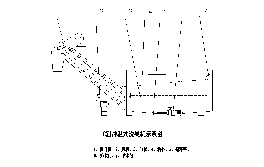 該機由機架、水箱、風機、提升機、氣泡管、噴水管等幾部分組成,工作時由於水中風力的存在,蔬果在水中任意方向翻滾轉動,並在高壓水力的推動下向前移動,在出口由一刮板提升機,將叼嘿视频大全送至下道工序。整體為分體式結構,水箱與輸送機、進出料鬥、罩板方便拆卸,易於清洗和檢修。