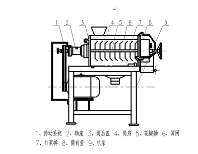 ★ 主要結構:傳動係統、軸承座、套軸、筒後蓋、擋漿盤、筒身、花鍵軸、篩網、刮板(或去核棒)、筒前蓋、機架等