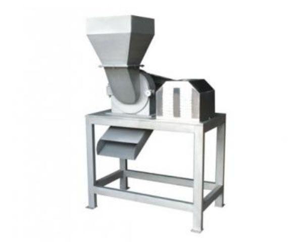 該機由機架、傳動罩、軸承座、機身、進料鬥、定子、轉子、刀片、大側蓋、出料鬥、鉸鏈、電機罩等部件組成。適用於蘋果、梨、西紅柿、根類等叼嘿视频大全破碎(核果類除外)。工作時電機帶動主軸旋轉。由前道工序升運上來的物料落入進料鬥中,物料進入機身後由於轉子上的筋板帶動物料高速旋轉,定子上的刀排將物料進行破碎(刀排可兩麵使用),此時物料一般粒度在4-8mm左右(可根據刀排的齒距、定子的槽寬及轉速而定),破碎後的物料從定子上的腰形孔中落入至出料口。