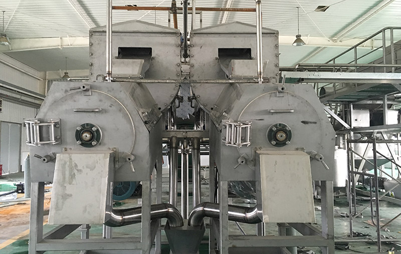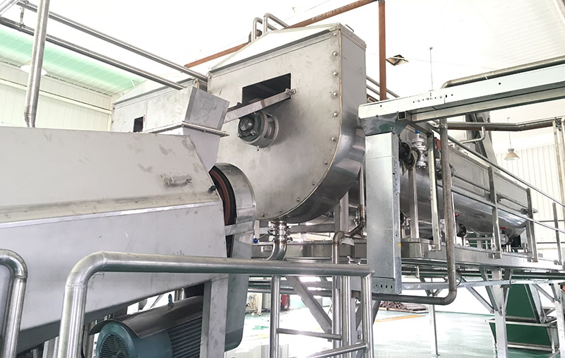 6. 去核製漿:經過破碎機初破碎的紅棗通過螺杆泵進入去核製漿機的打漿室內,通過打漿葉片的高速旋轉作用下使物料獲得離心力而拋向篩網,物料在打漿葉片與篩網 進行產生相對運動的過程中因受到離心力以及揉搓作用而被進一步打擊成漿,物料經篩網孔進入收集器,再由螺杆泵輸送至下一工序,而渣皮、果核等則由出渣鬥排出。