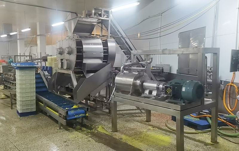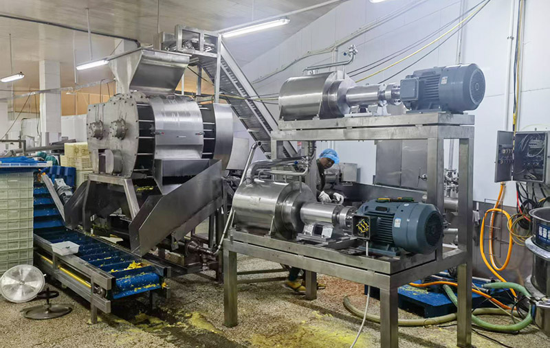 3.榨汁:采用全果榨汁機通過上下兩個榨杯擠壓柑橘,果汁和部分果肉纖維通過中間的預濾管流出,果皮和籽渣由2個通道分開,皮油也有單獨通道,全果榨汁機的榨杯分大、中、小3種型號,40~60果徑適合小榨杯,選擇適當榨杯對提高柑橘榨汁率有很大作用,柑橘榨汁率一般在51%左右。